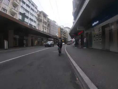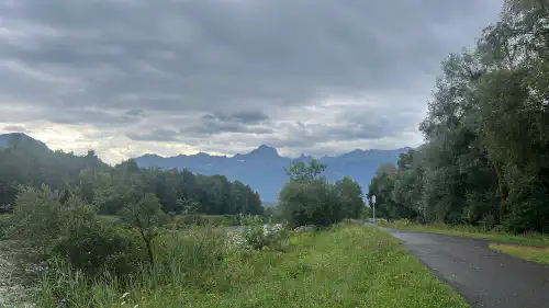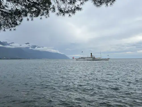 The cloud and cool weather then started to dissipate and we had bursts of intense heat, when the sun came out. We followed the edge of the lake, slowly gaining height, and we stopped for Subway lunch in Vevey whilst waiting out a sudden rainstorm. We were both a bit surprised that Lausanne was still a fair distance to travel.